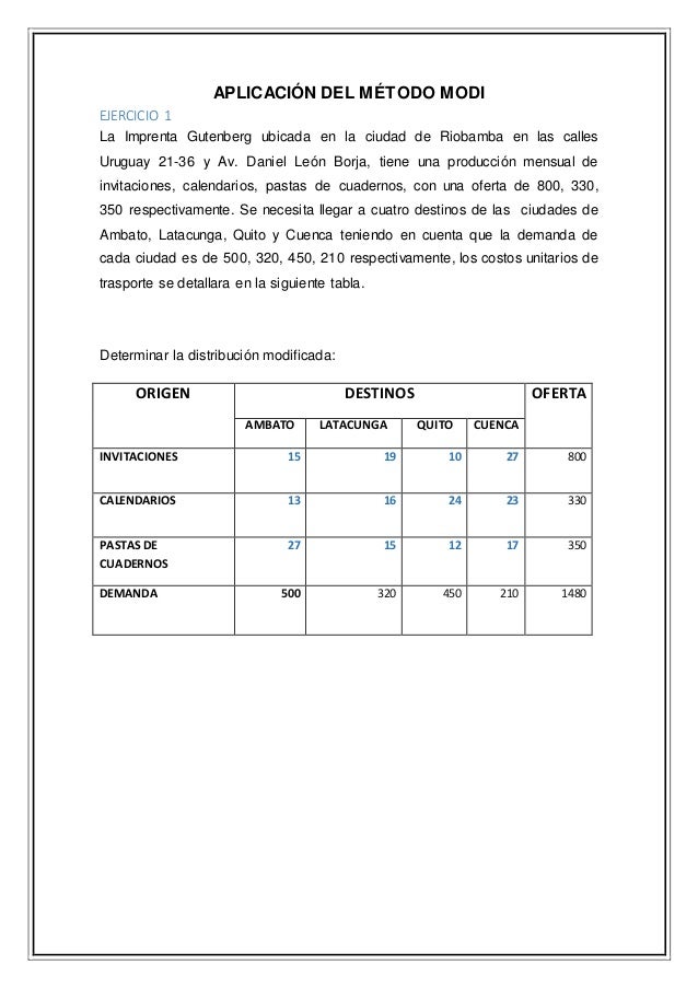El algoritmo de modi conocido como el método de los costos ficticios, consiste en añadir a la matriz de costes una fila y una columna que recogen unos costes ficticios determinados arbitrariamente (los números MODI) tal que permite calcular los índices de mejora par las celdas (casillas) no utilizadas.